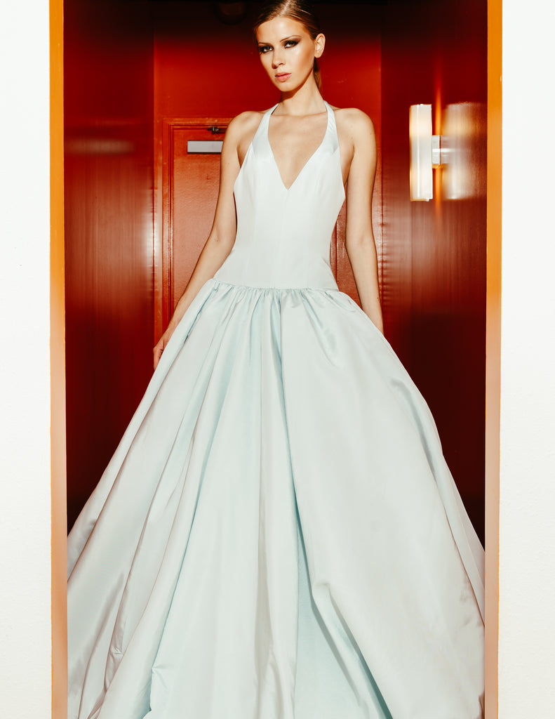 Ethereal and commanding, Écume de Lune evokes the serene glow of moonlight upon still waters. This halter-neck ballgown in Glace Aigue-Marine silk taffeta cascades into a voluminous skirt, its crisp structure and subtle sheen enhancing the sculptural flow of every movement. Minimalist yet arresting, it’s a study in pure, architectural elegance.