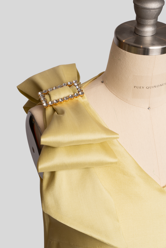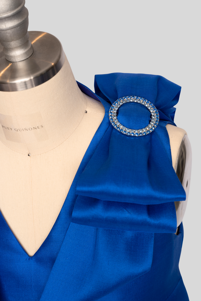 Anisa, meaning “grace” in Thai, this design radiates refined strength and femininity through sculptural bows crowned with jeweled buckles. Each detail reflects the artistry of couture craftsmanship, brought to life in the US with the luminous beauty of handwoven Thai Silk.