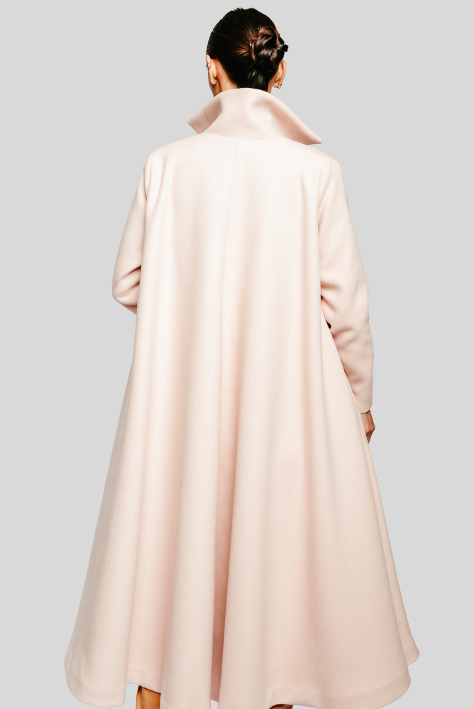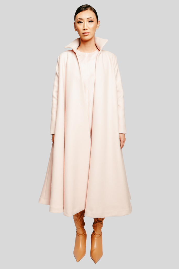 Crafted from 100% cashmere, this coat envelops the wearer in luxurious softness while maintaining impeccable structure. The high standing collar and sweeping A-line cut lend architectural drama, while discreet pockets and a flawless drape add an air of ease and refinement.
