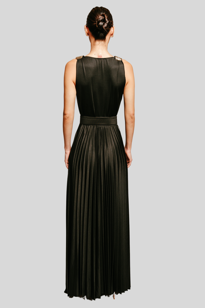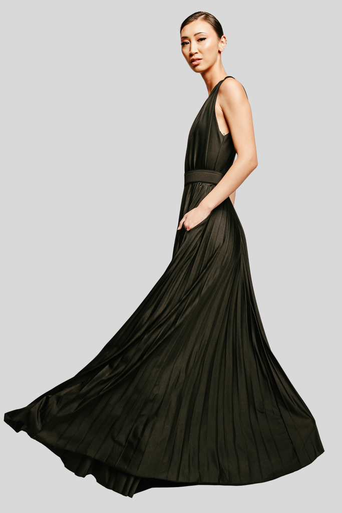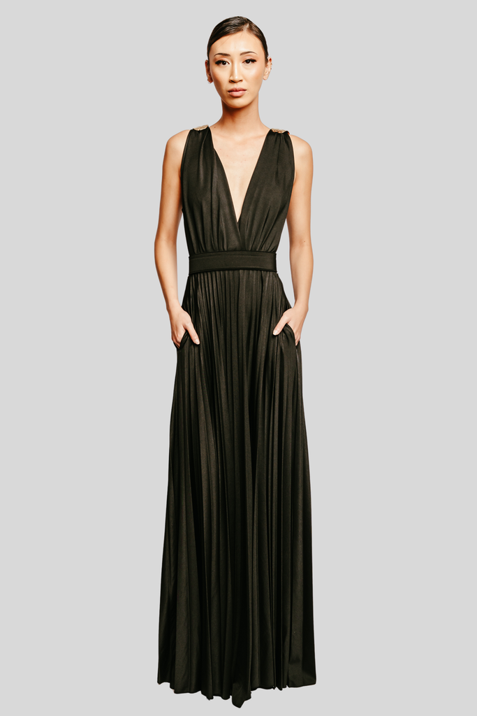 Crafted from electric pleated jersey, this floor-length gown drapes effortlessly over the body, creating graceful movement with every step. The deep V-neckline and cinched waist sculpt the figure, while subtle metallic undertones in the fabric lend a touch of luminous sophistication.